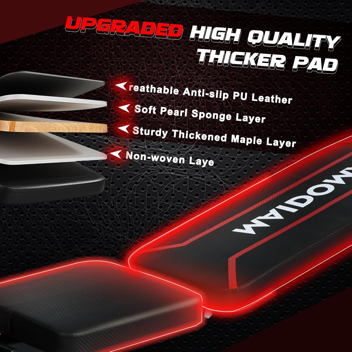 【Comfortable Experience】Load bearing spongewith sweat-proof leather,The widened backrest and contoured seat cradle your body during decline sit-ups and heavy lifts, while the upgraded leg roller prevents bruising during ankle curls