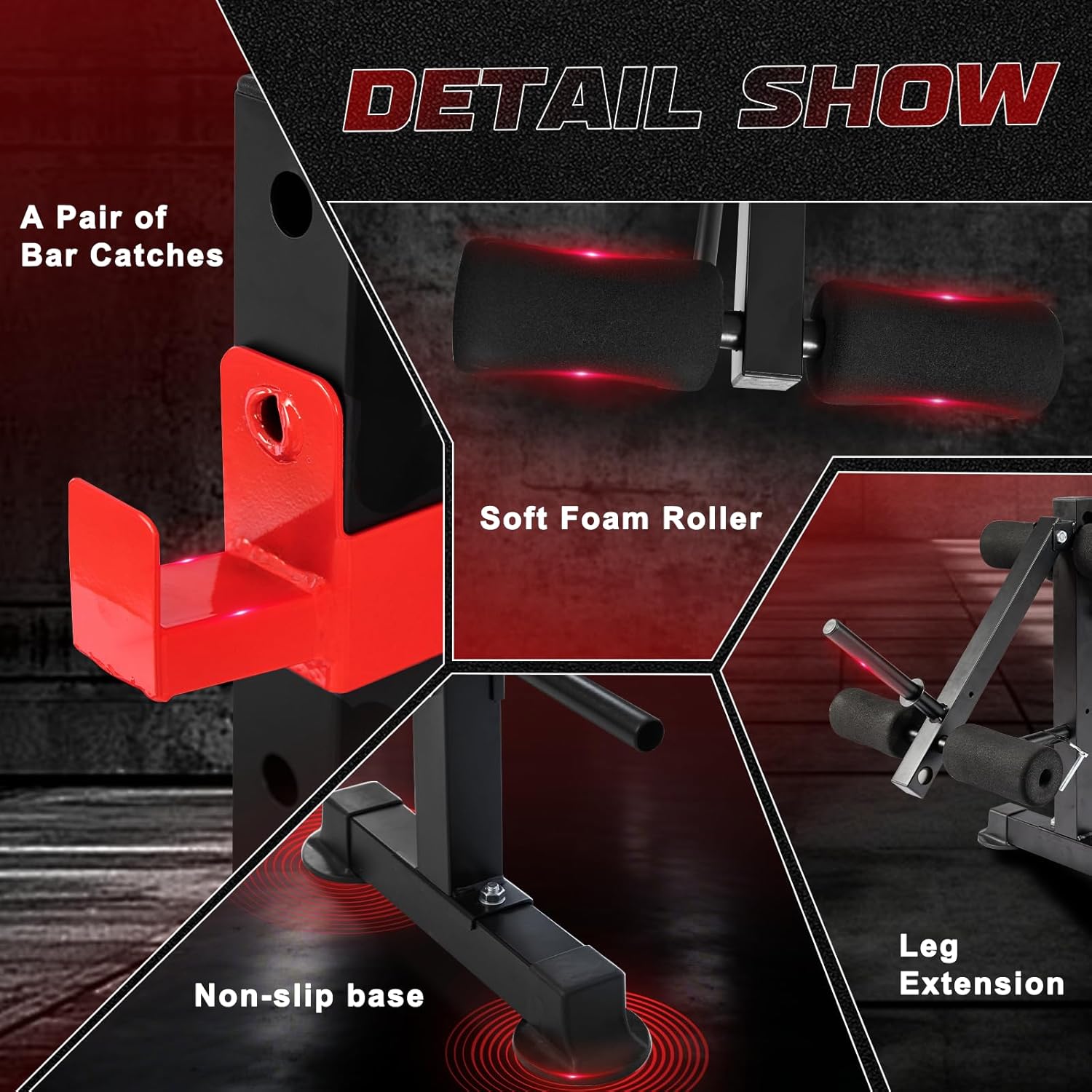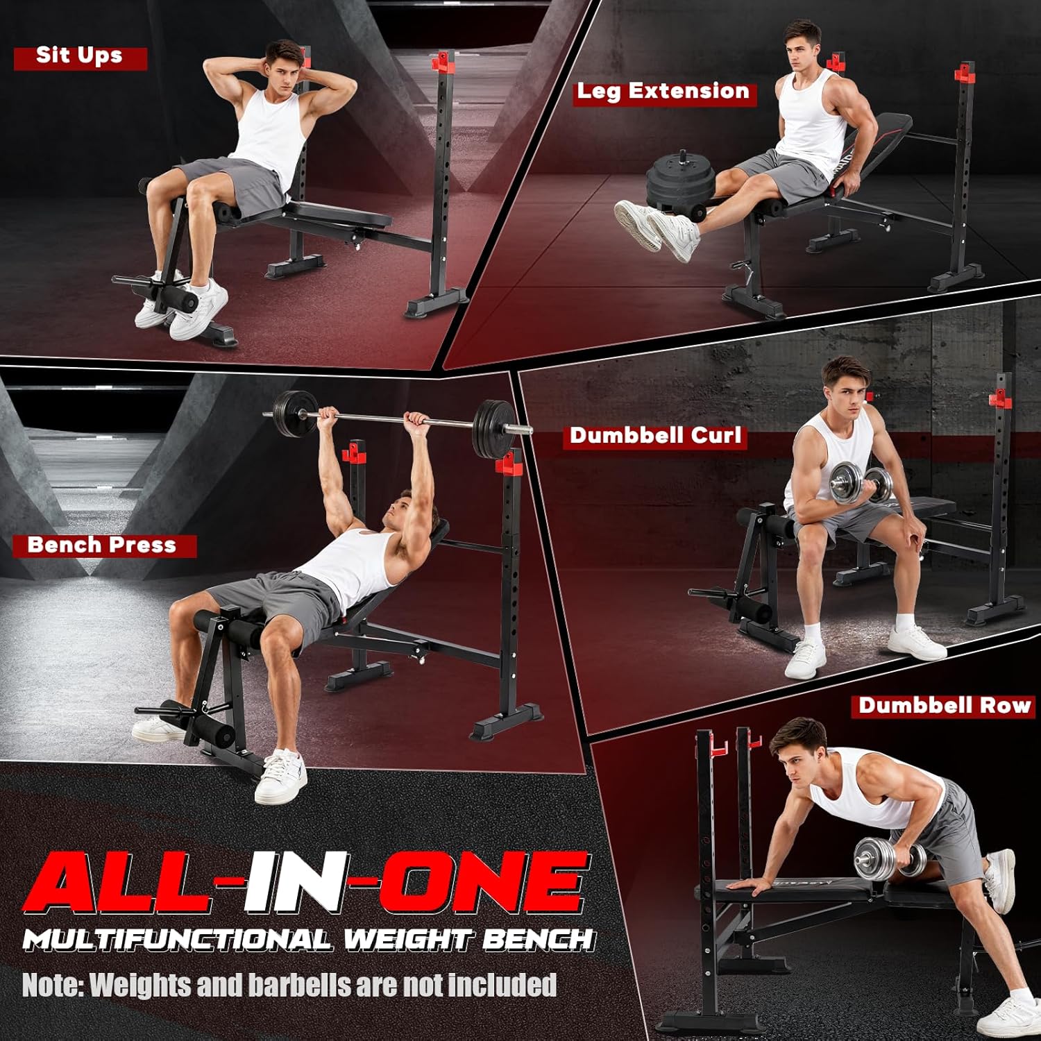 【Multi Angle Adjustable】Customize every workout with 4-position backrest (flat/incline/decline) and 8-height barbell rack adjustments. Optimize incline bench angles for upper chest definition, decline sets for lower abs, or perfect shoulder press alignment – tailored for all body types and fitness goals.