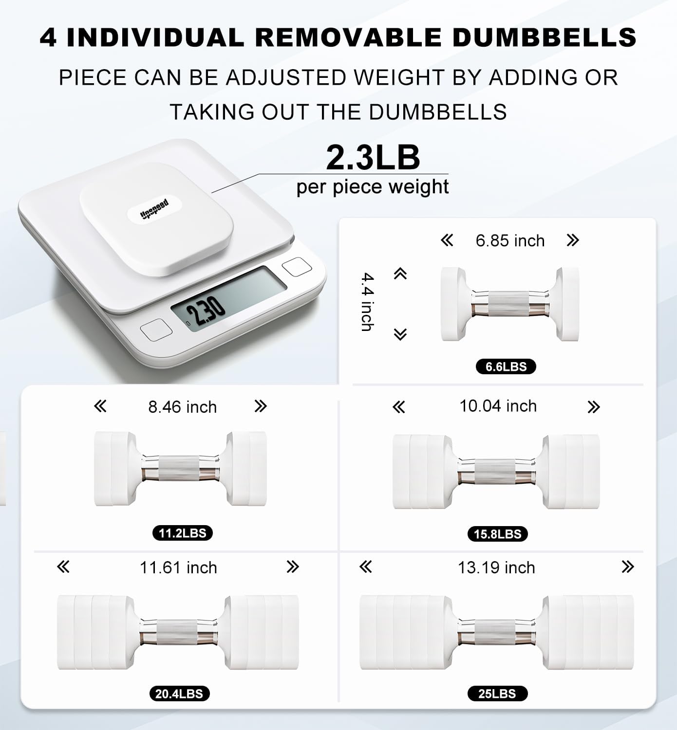 5 in 1 Adjustable Hand weights dumbbells set for men women. Our dumbbell sets consists of 10 weight dumbbell plate, adjustable range is 6.6lb, 11.2lb, 15.8lb, 20.4lb, 25lb each weight (A Pair 13.2lbs 22.4lbs 31.6lbs 40.8lbs 50lbs).
