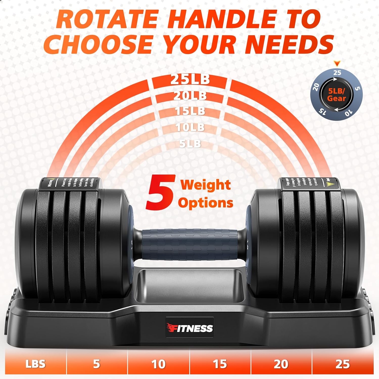 5 In 1 Weights Adjustable:Adjustable dumbbell weights set with 5-25 lb range in 5 lb increments via dial(each includes 5/10/15/20/25lb).Replace 5 traditional dumbbell sets for versatile home gym strength training