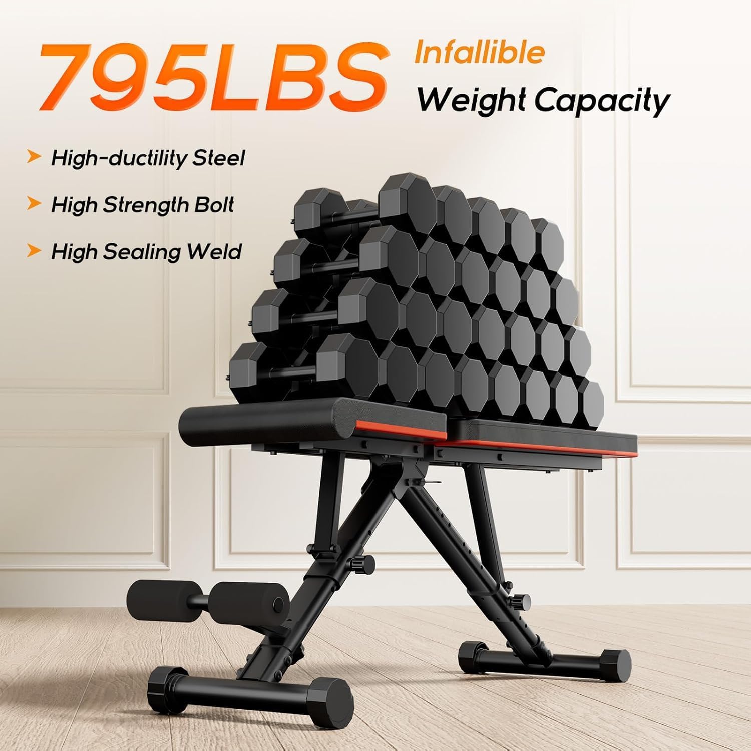 【Heavy-Duty Weight Capacity】Built to withstand rigorous workouts, this weight bench supports up to 795 lbs, making it a robust choice for both beginners and seasoned lifters. Its solid construction ensures stability and safety during heavy lifts, allowing you to focus on your performance without worrying about equipment durability.