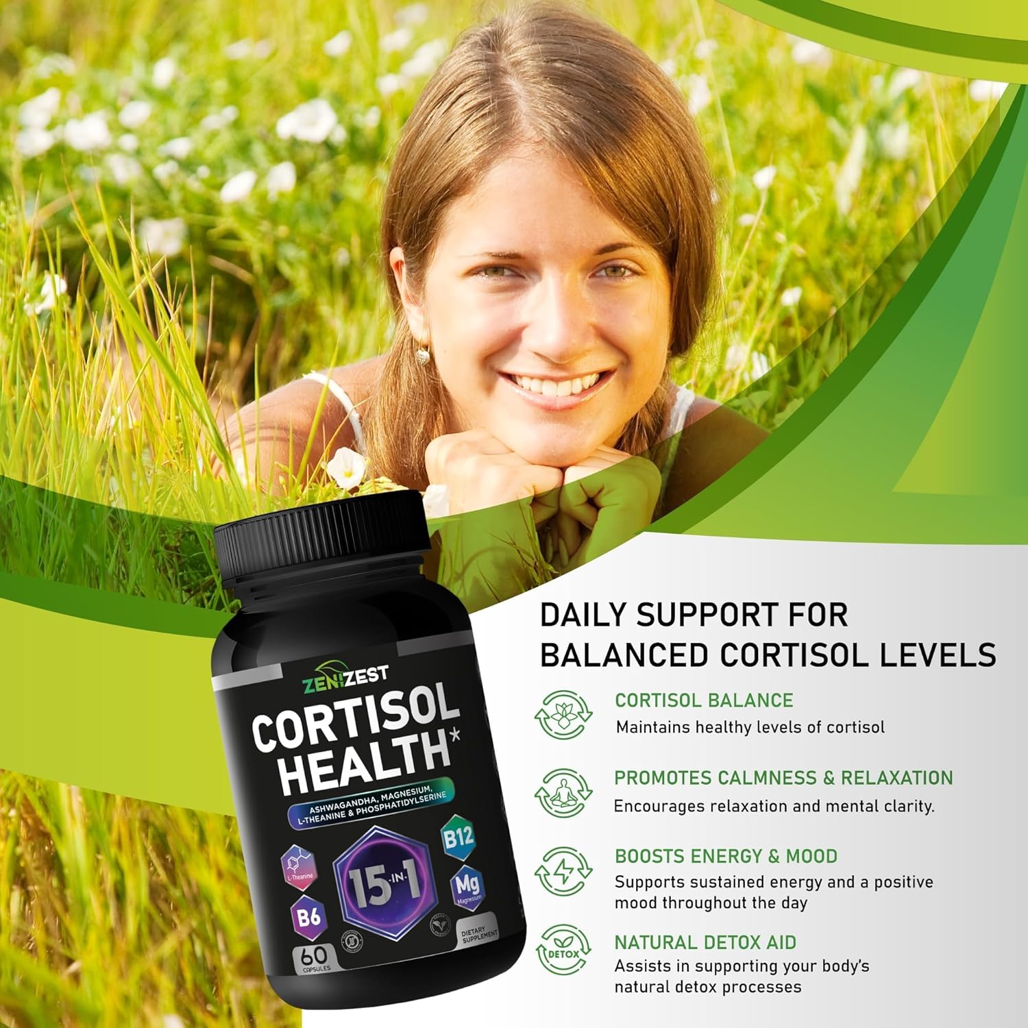 Complete Cortisol Support: Support a sense of calm and clarity with ZeniZest Cortisol Detox Supplement for Women and Men. This natural cortisol reducer and adrenal support complex supplement features Magnesium Glycinate, Ashwagandha, L-Theanine, Phosphatidylserine—combined with vital nutrients and adaptogens to help the body reduce high cortisol, support stress management and contribute to overall health, balance and wellness.