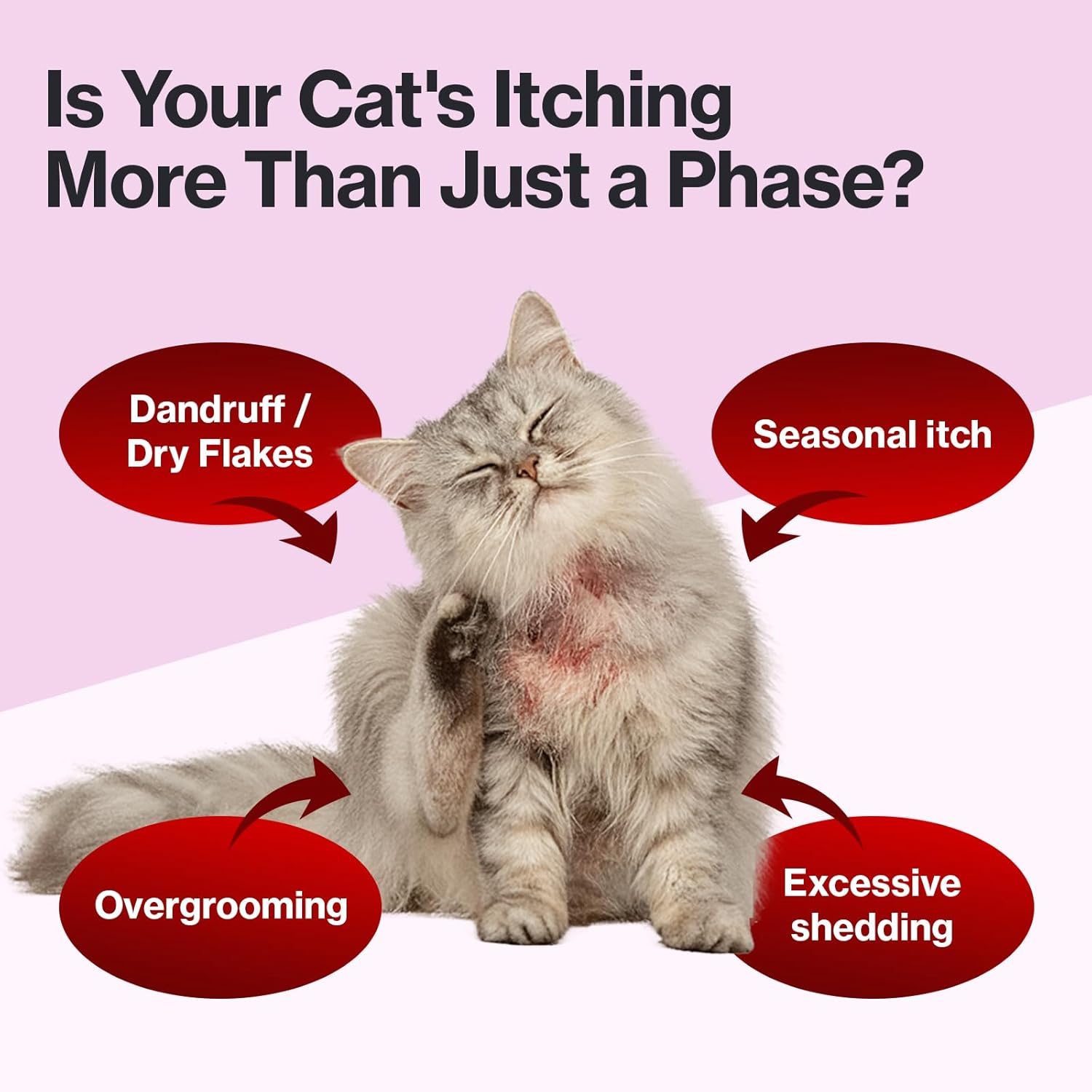This formula supports cat itchy skin relief with Omega-3s, spirulina, and AF-343. It helps calm scratching and overgrooming while promoting overall skin comfort.