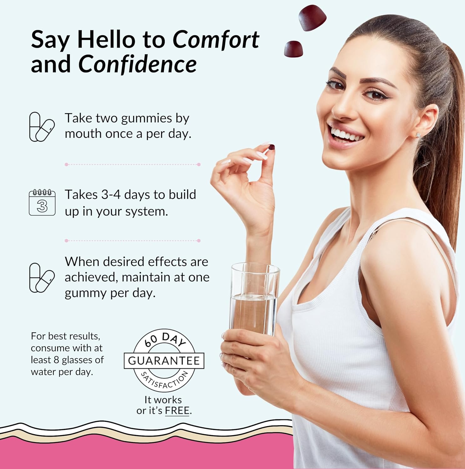 Relief from Vaginal Dryness: These feminine gummies help alleviate vaginal dryness, irritation, and discomfort caused by hormonal changes, stress, or medications. A natural vaginal dryness treatment that works from within