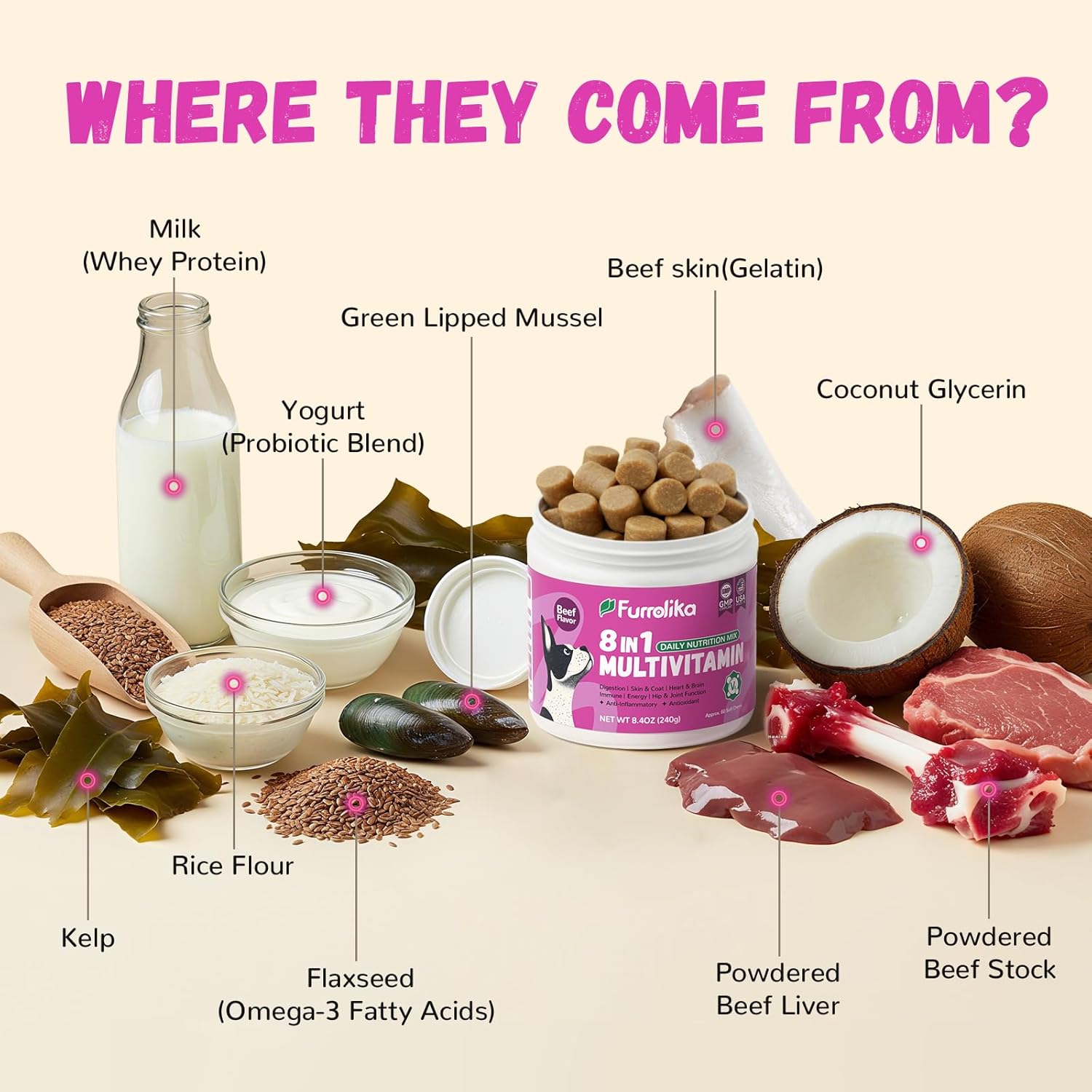 COMPREHENSIVE 8-IN-1 SUPPORT – Furrolika’s dog multivitamin offers a range of key benefits: digestion, skin & coat health, heart & brain function, immune system, energy, hip & joint health, and antioxidant support. Suitable for dogs of all sizes.