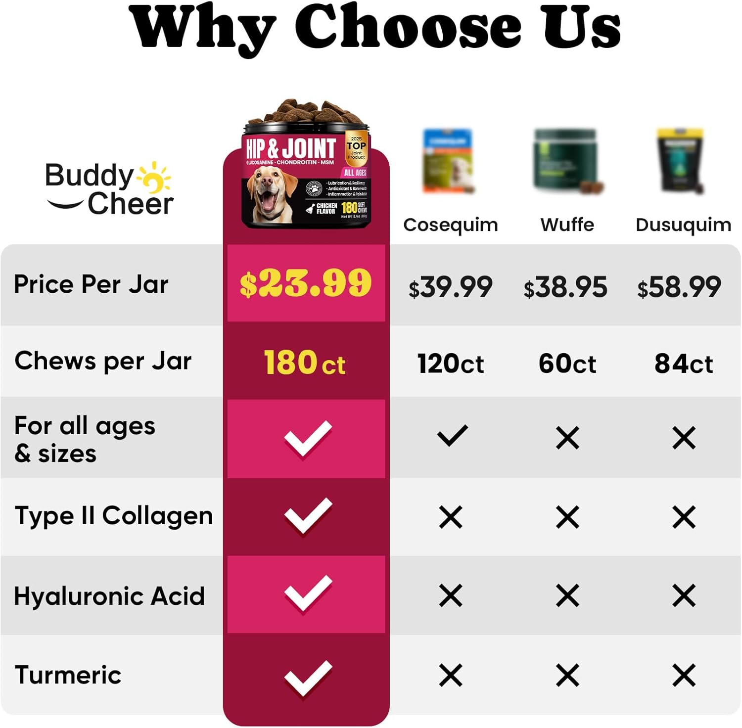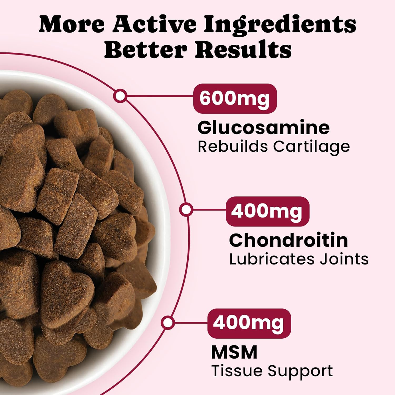 【Rich in Ingredients】 Our pet chews are infused with hyaluronic acid, helping to repair damaged cartilage and boost lubrication, supporting your pet’s mobility and overall comfort.