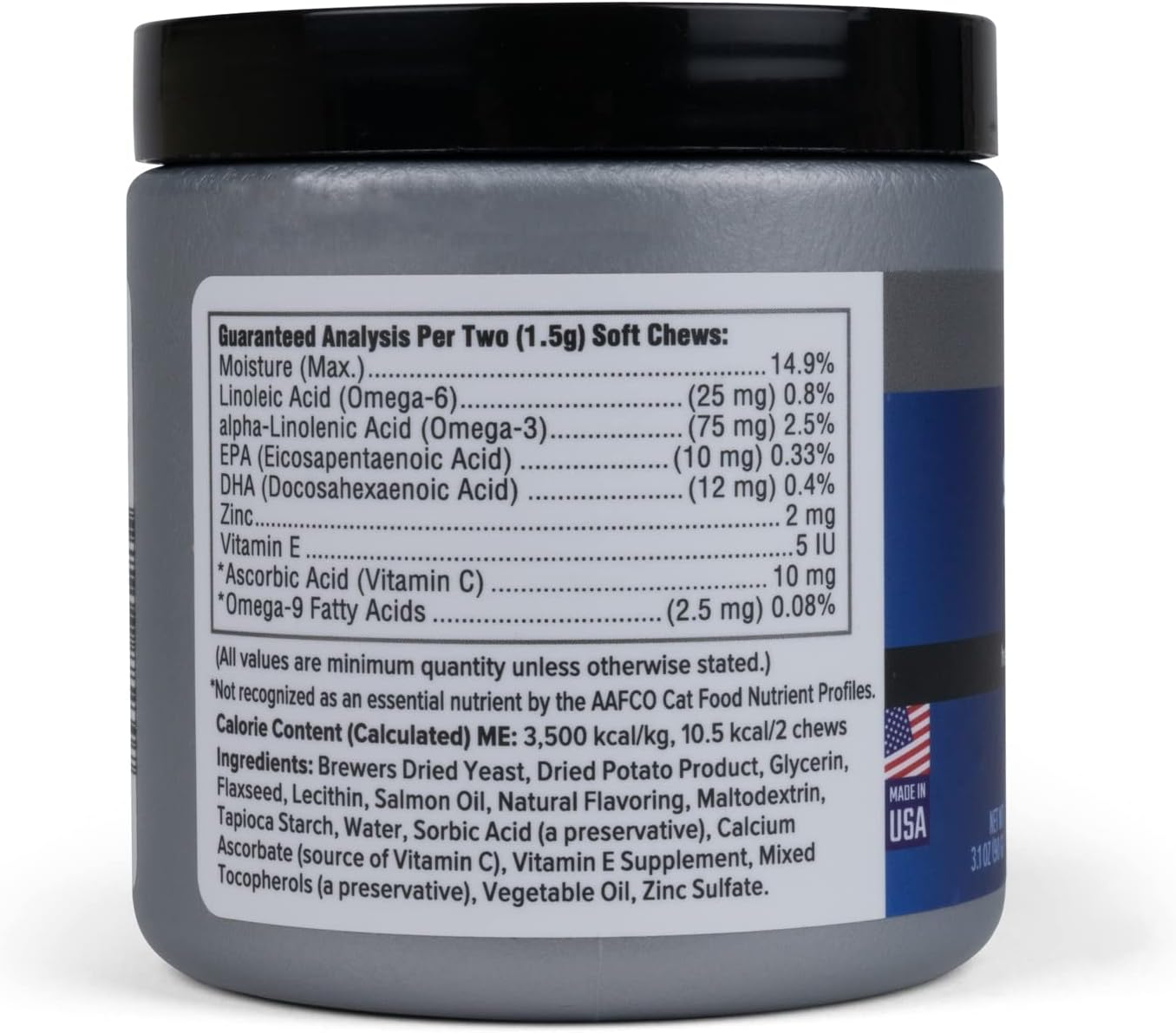 HEALTHY SKIN & COAT – GNC Pets Ultra Skin & Coat Soft Chews for Cats are formulated with omega fatty acids, Vitamin E, and Salmon Oil to support healthy skin and a glossy coat. Ideal as an anti-shedding supplement that treats dry skin issues