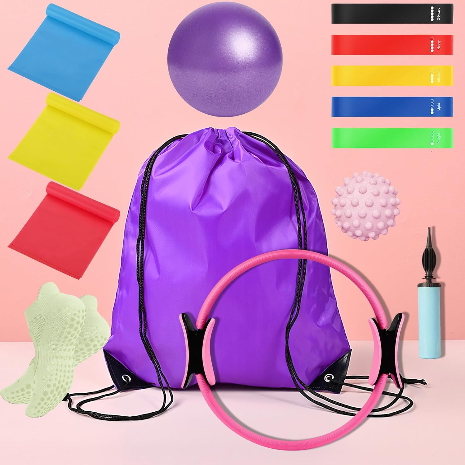 All-in-One Pilates Equipment – 1 pcs pilates ring, 1 pcs pilates ball, 5 pcs yoga bands, 3 pcs resistance band, 1 pcs massage ball, 1 pair non-slip pilates socks, 1 pcs inflator, 1 pcs gym bag, 1 pcs Instruction manual. A full-body workout targeting strength, balance, and flexibility