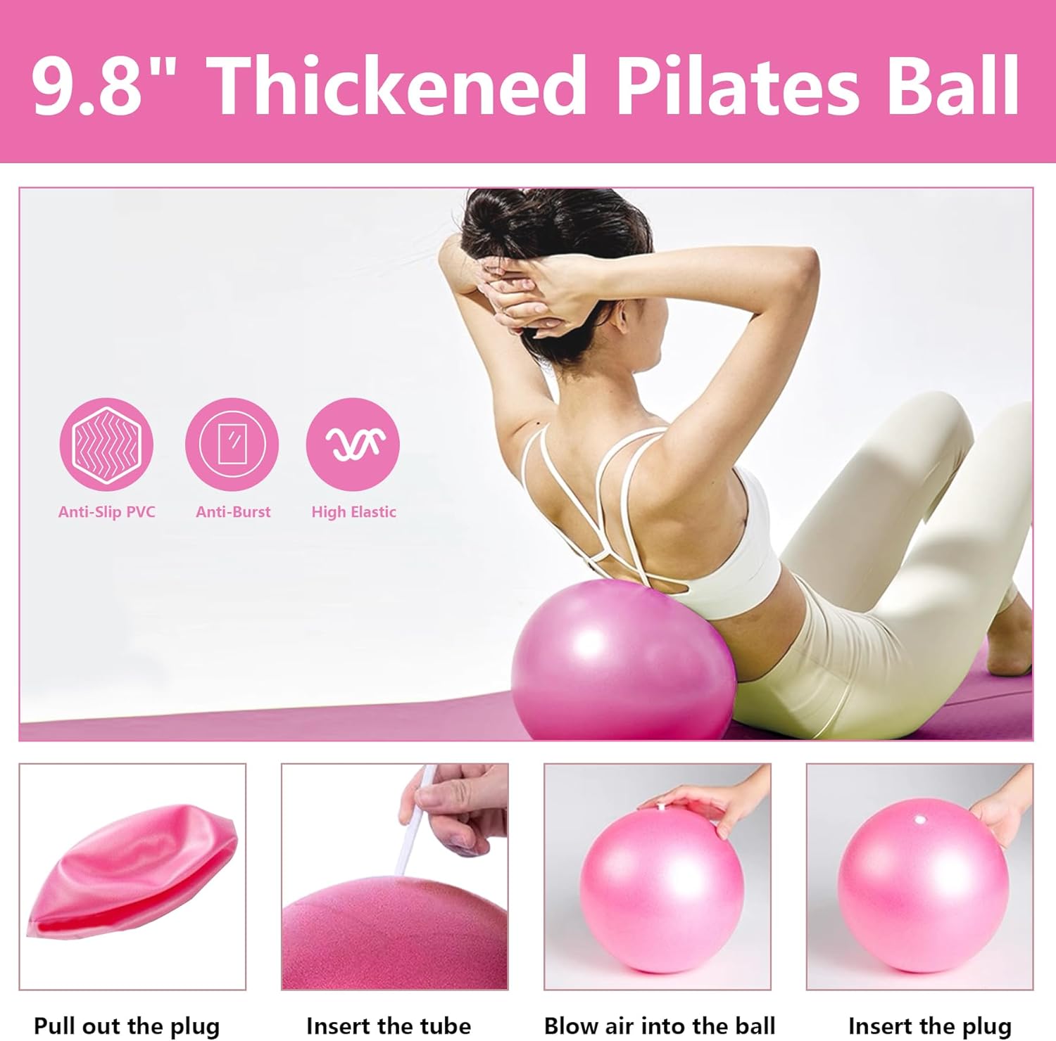 [12″ Pilates Ring & 9.8″ Pilates Ball]: The pilates ring was made of high intensity fiberglass and comfortable foam cover. the pilates ball was made from thickened and strong PVC material,anti-burst ensure the safety and durability