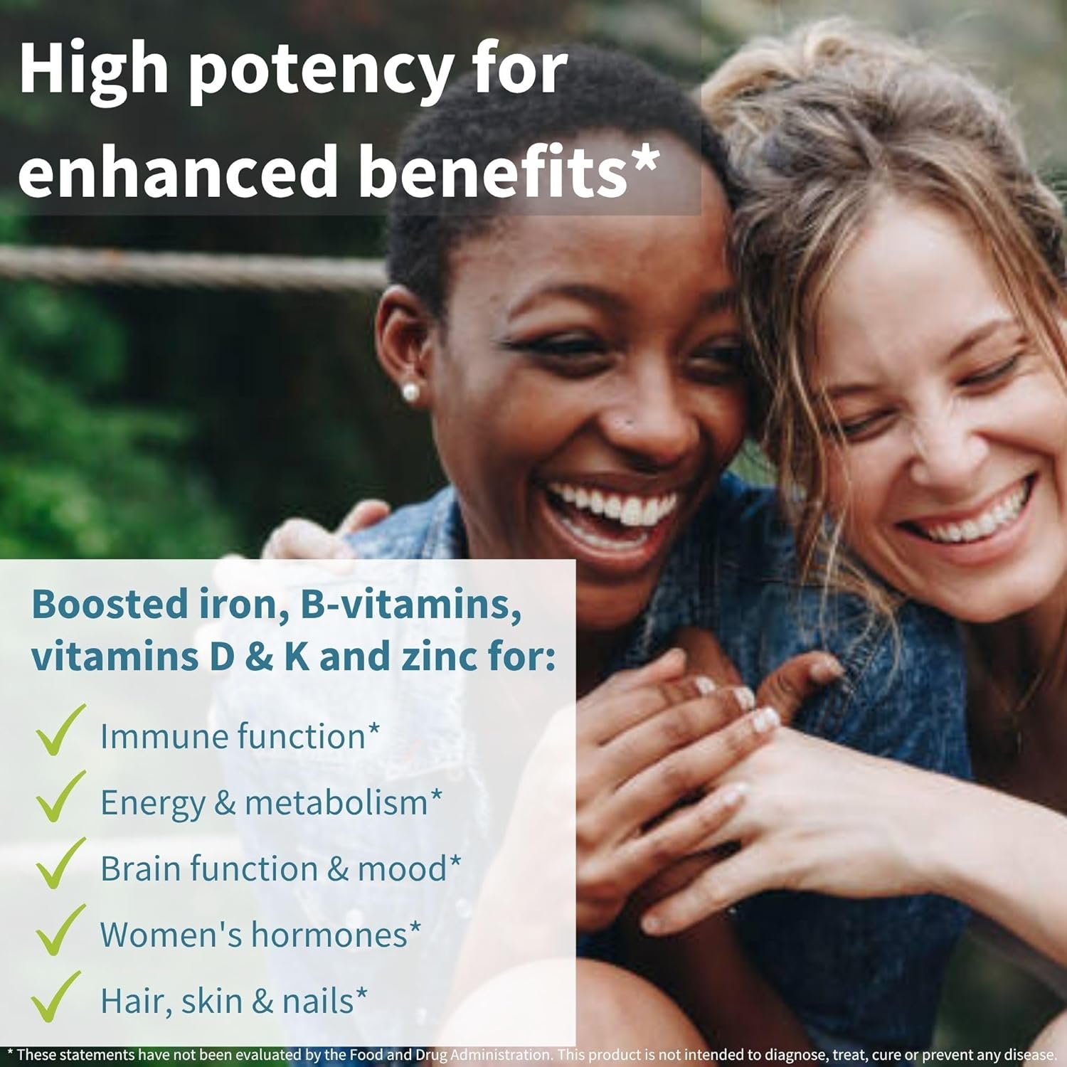 HIGH POTENCY we have boosted levels of iron, B-vitamins, vitamin D and zinc in ratios that work in balance with the body. Provides enhanced support for energy, immunity, hormone balance and mood. Supplementing with iron may not be suitable for postmenopausal women*