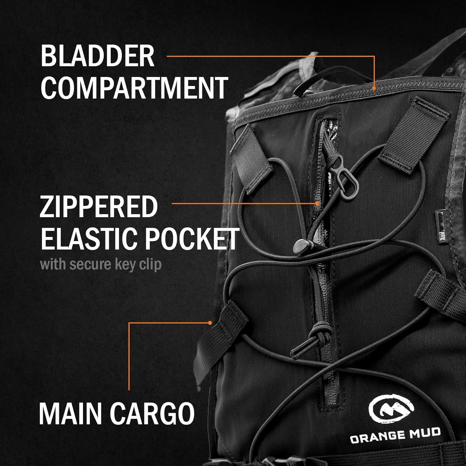 Compartment 1: Bladder compartmentCompartment 2: Main cargoCompartment 3: Zippered elasticShoulder pocket storage: Phone, gel, nutrition, electrolyte and more, both sidesFront chest pocket storage: 20oz/600ml soft flask capable and trash pockets (not included)