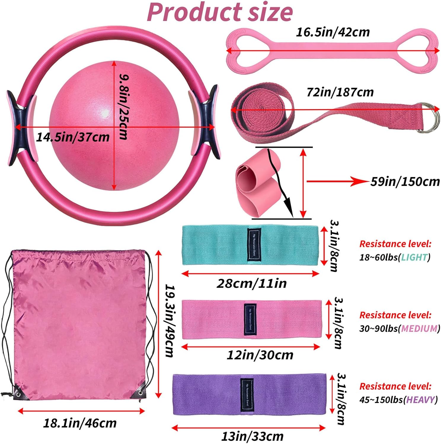 1.**All-in-One Fitness Solution** = This Pilates Essentials Kit includes 9 essential tools: 1 Pilates ring (15 inches), 1 yoga ball (10 inches), 3 types of hip resistance bands, a figure-of-8 resistance band, a fabric resistance band, a 59 inches elastic band, and a lightweight fitness backpack bag—perfect for toning, stretching, and building core strength at home or on the go.