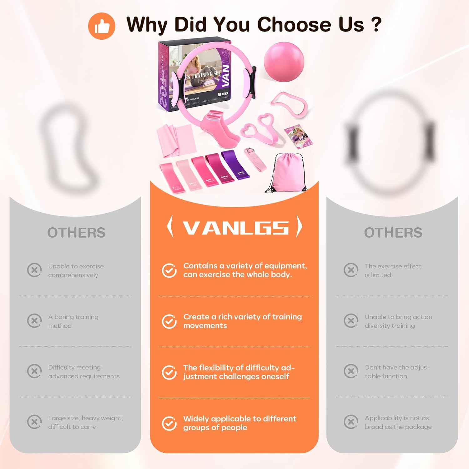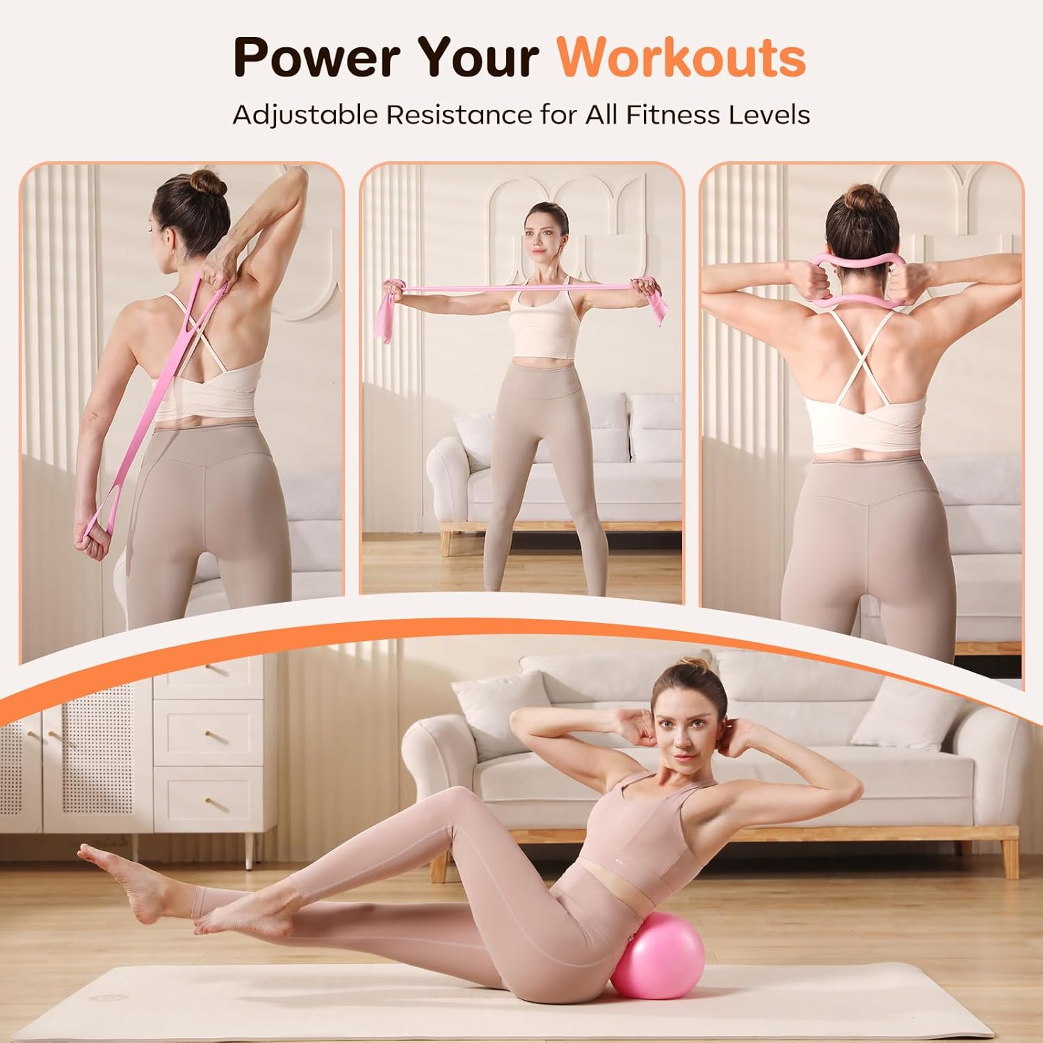 [All-in-One Pilates Kit for Women – Full Home Workout Solution] This complete home pilates set includes 13 essential pieces – 13″ pilates ring, 10″ exercise ball, figure 8 resistance band, stretching strap, yoga socks, resistance band, arm exerciser, 5-level resistance bands, and storage bag. It offers everything needed for an home pilates kit, making it ideal for at home workout equipment