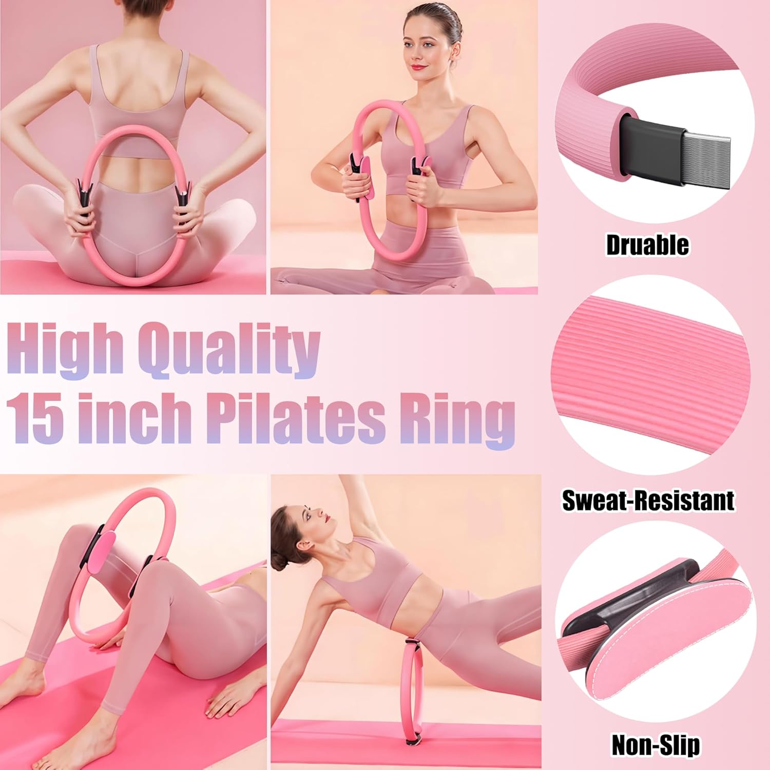 Pilates ring and ball set: The 15in Pilates ring and 9.8in yoga ball provide ideal resistance ranges for most users and exercise scenarios.Its featherlight portability transforms any space into a resistance-training zone, perfect for targeting stubborn thighs, carving abs, and correcting slouching posture without gym hassles.