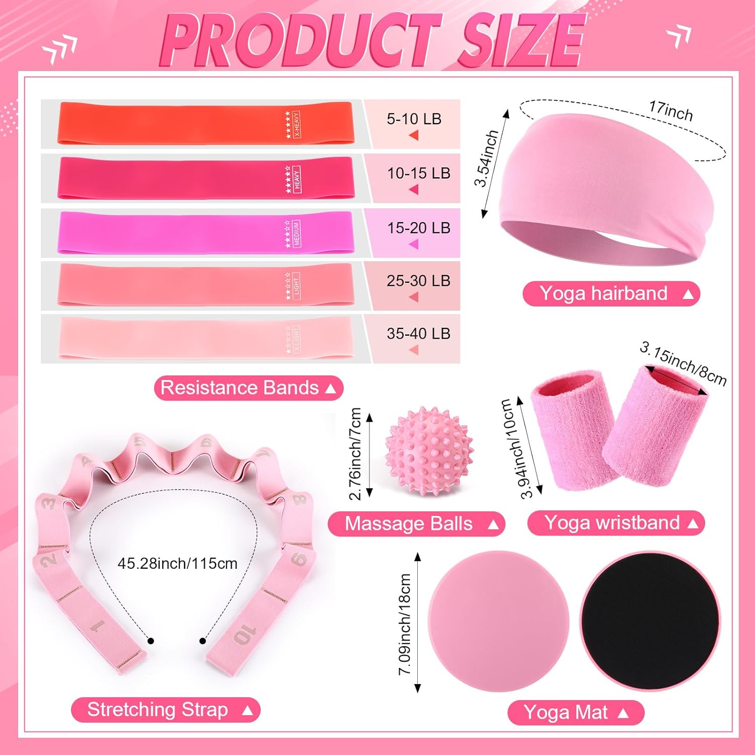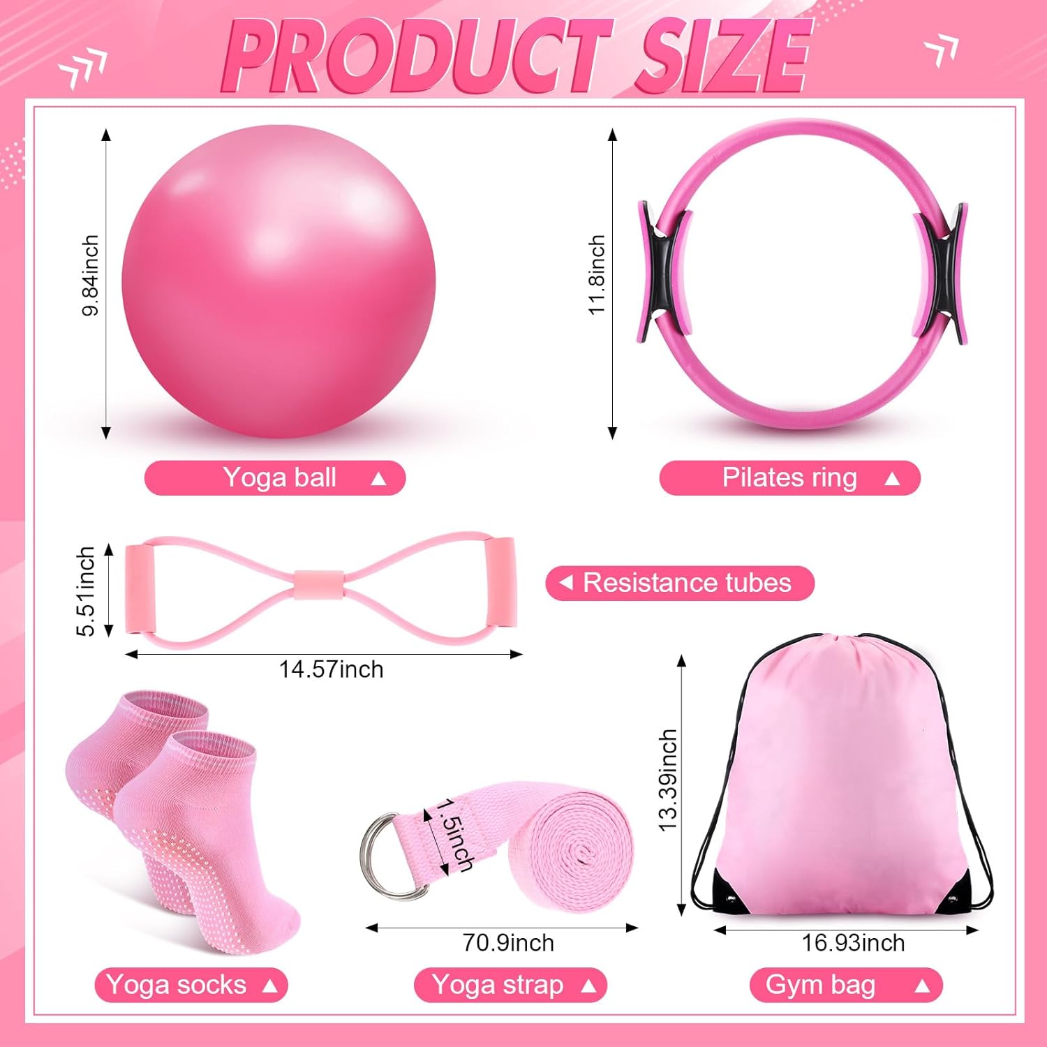 Suitable Size: the diameter of the Pilates ring is 11.81 inches, the ball is 9.84 inches, the diameter of the foot sliding plate is 7.09 inches, the diameter of the fascia ball is 2.76 inches, the circumference of the yoga belt is 23.62 inches, the backpack is 13.39 x 16.93 inches, and the length of the yoga segmented belt is 45.28 inches