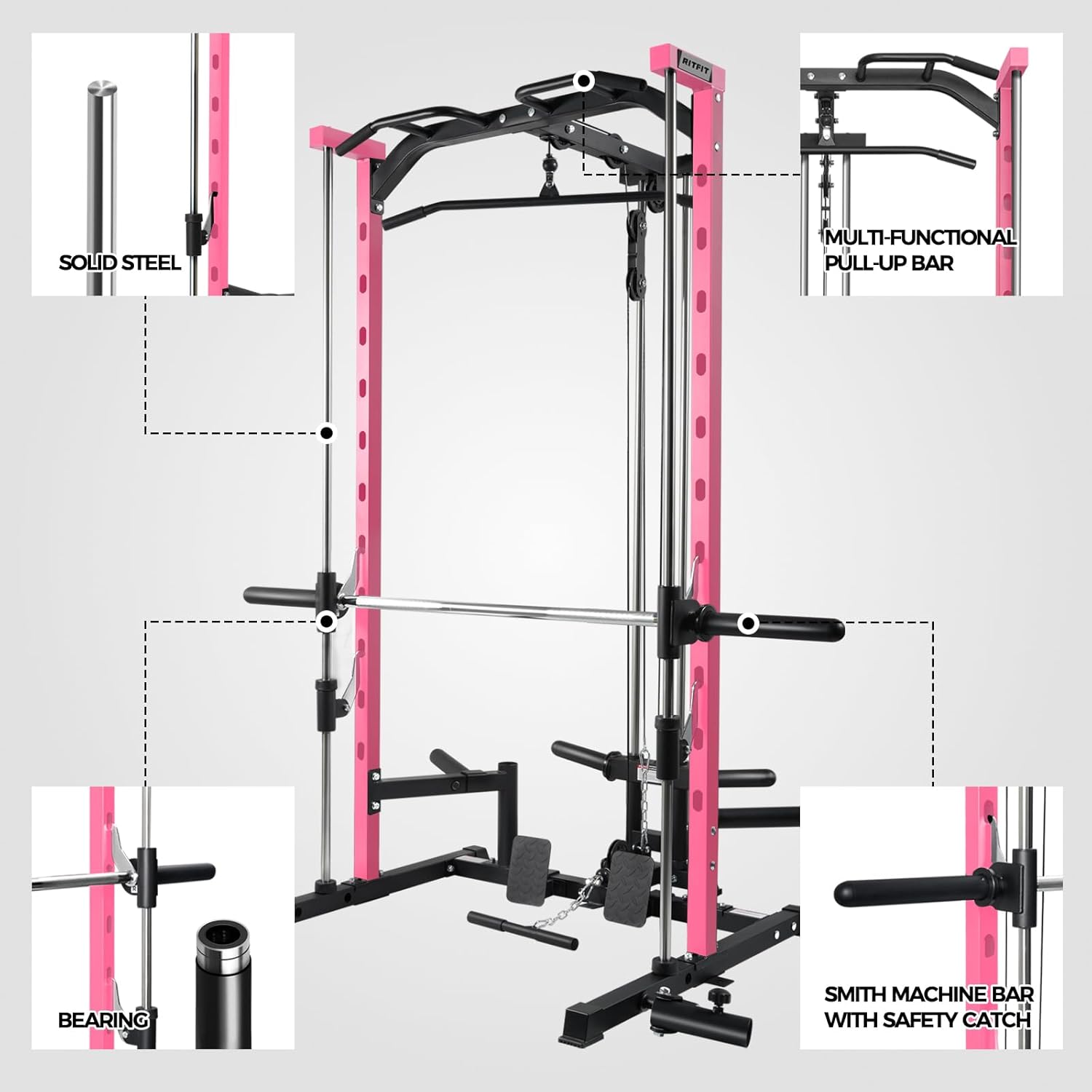RitFit Smith Machine Power Rack with LAT-Pull Down System, Landmine, Barbell Bar, Plate Storage Pegs and More Training Attachment