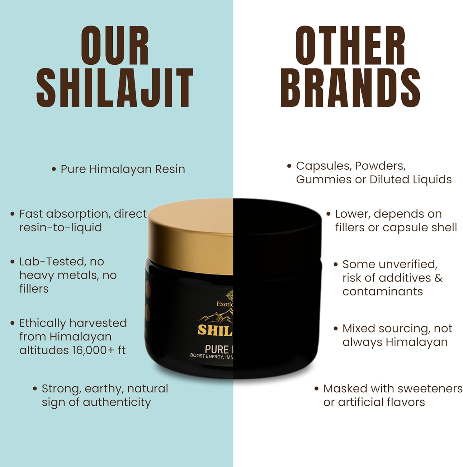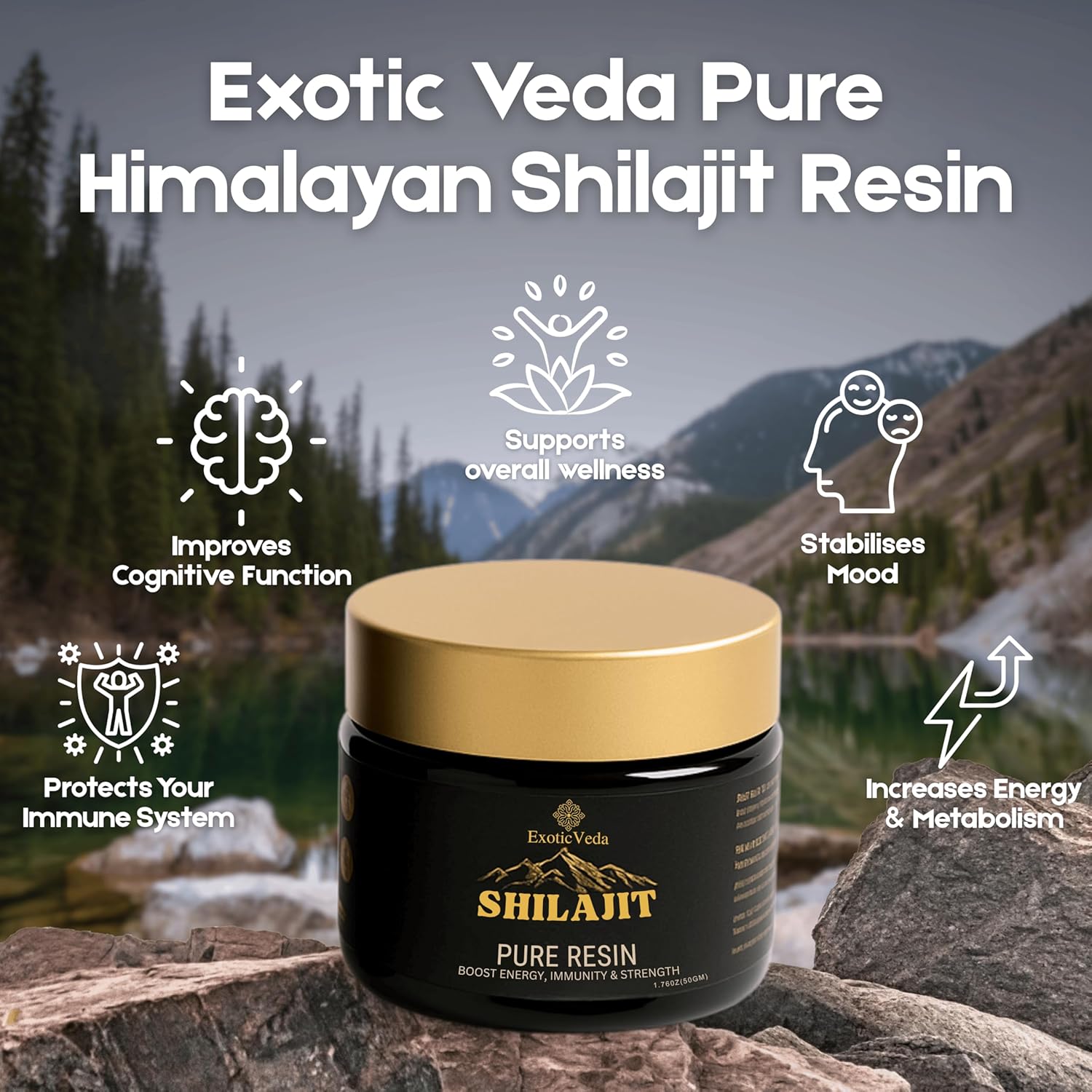 PURE HIMALAYAN SHILAJIT RESIN – Exotic Veda presents premium grade Shilajit resin, sourced from the untouched heights of the Himalayan mountains, where it naturally forms over centuries from mineral-rich rocks. This ancient Ayurvedic treasure is carefully purified to preserve its authenticity, potency, and effectiveness. Packed with essential minerals, fulvic acid, and trace elements, it supports energy, stamina, focus, and overall wellness. Known to boost vitality, strengthen immunity, and promote balance in mind and body, our Shilajit resin connects you with centuries of holistic healing traditions, making it an essential daily supplement for modern healthy living.