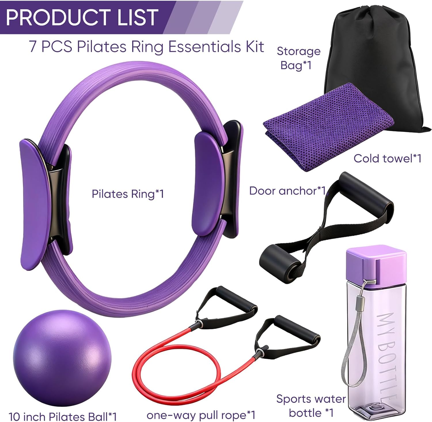 Integrated Fitness Solution: this complete yoga and Pilates equipment kit includes 7 basic tools: 13 inches pilates rings, 10 inches yoga ball, one-way pull rope, door anchor, cold towel, sports water bottle and storage bag, very suitable for conditioning, stretching and core strength exercises at home