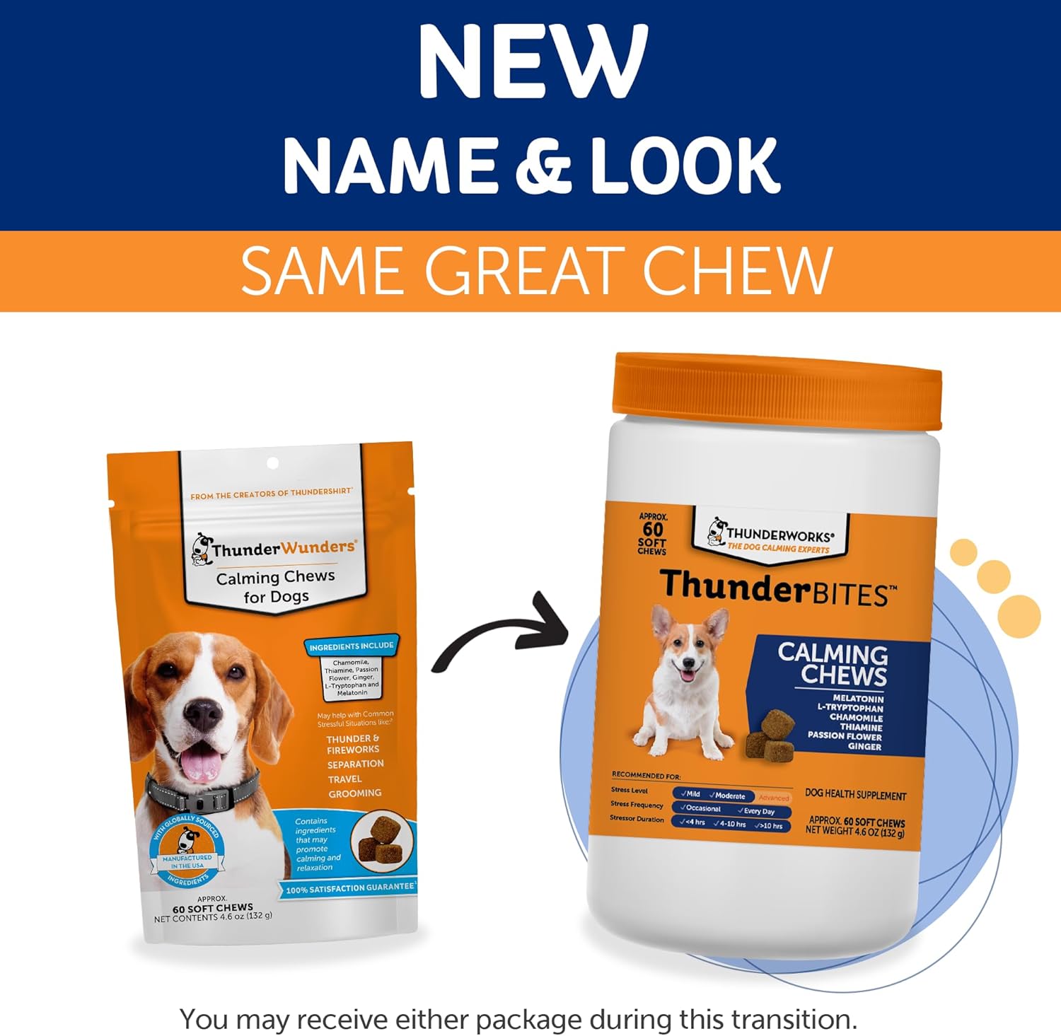 ThunderBites Calming Chews, formerly ThunderWunders, promote calming and relaxation and may help reduce the effects of environmental stress to keep your dog at ease.