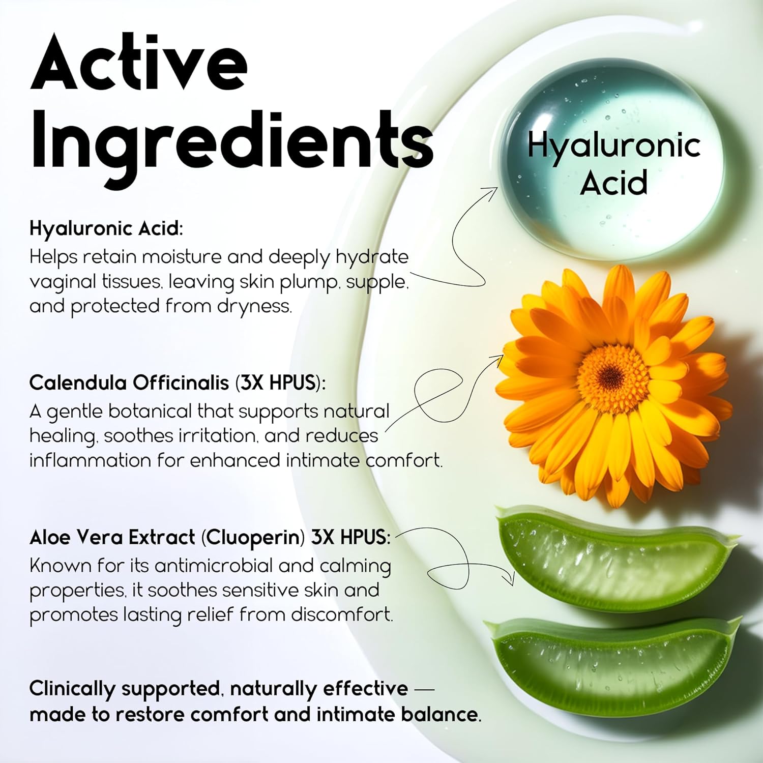Natural and Safe This hyaluronic acid vaginal moisturizer Made with natural ingredients like olive extract, hyaluronic acid, and plant-based oils, this paraben and glycerin-free vaginal moisturizer is perfect for feminine care. It’s hormone-free, offering relief for vaginal dryness and irritation.