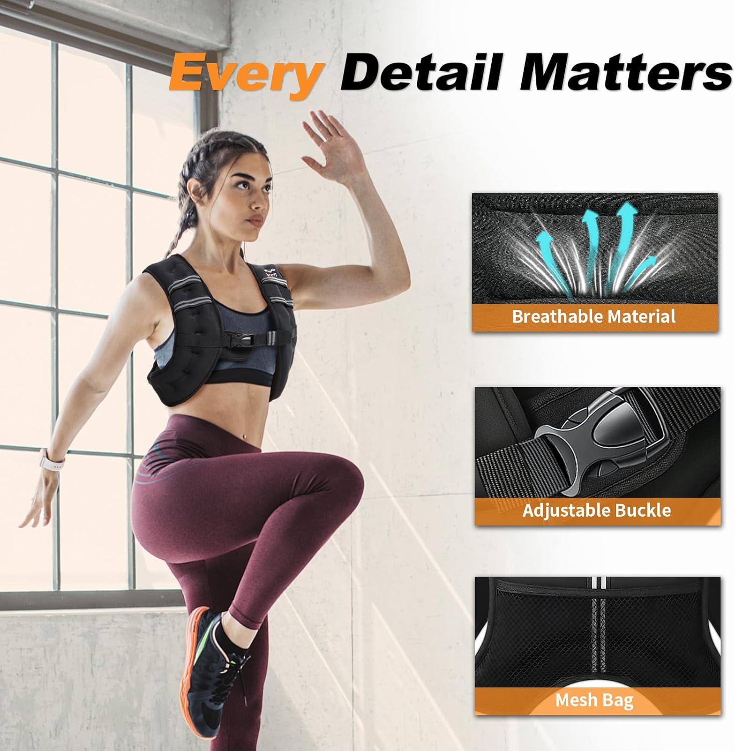 CONVENIENT & SAFE DESIGN: With dual storage options—one detachable front pocket and a back mesh pocket—this weighted vest for walking securely holds your essentials like phone, keys, and headphones. Plus, the eye-catching reflective straps enhance visibility during nighttime workouts, ensuring your safety while you push your limits.