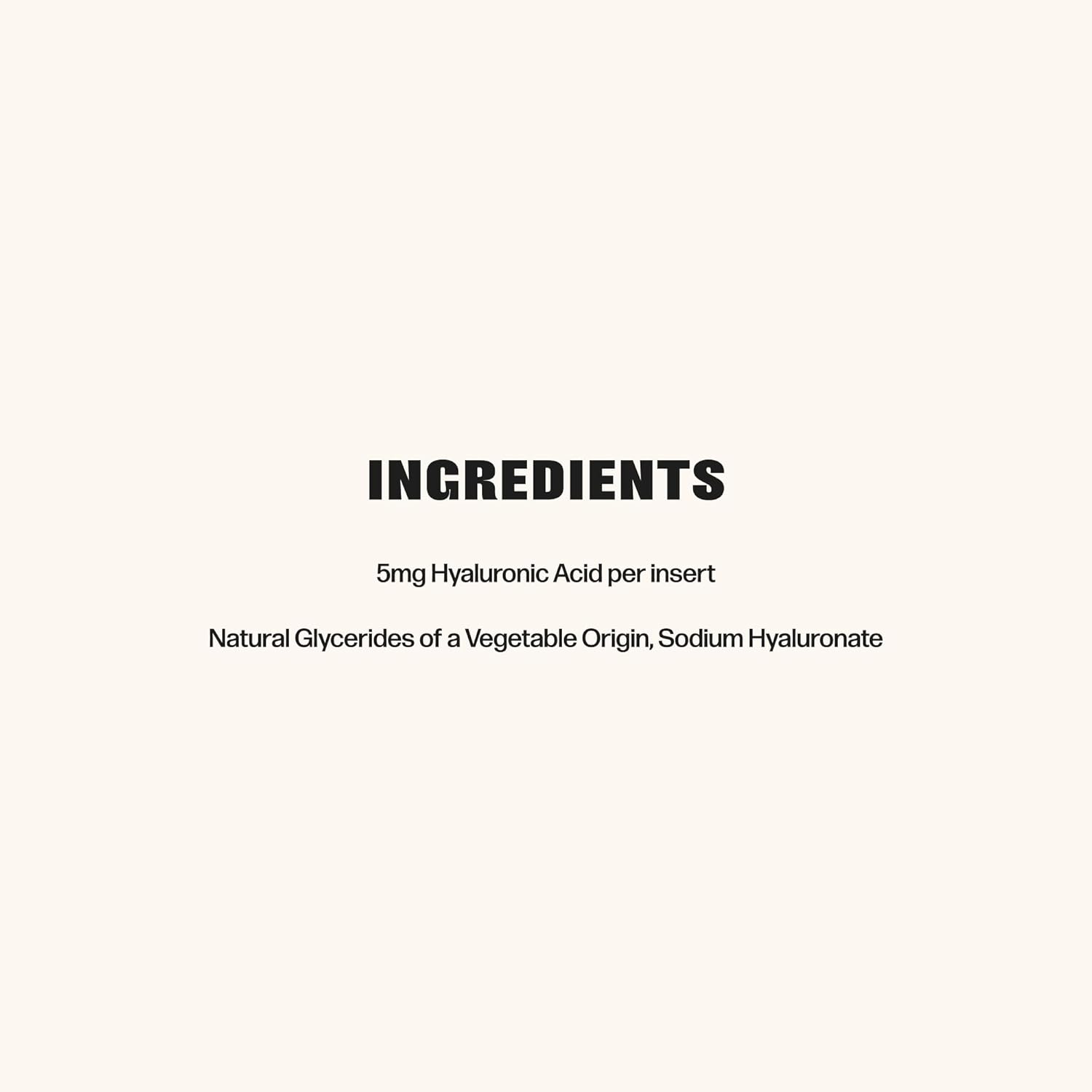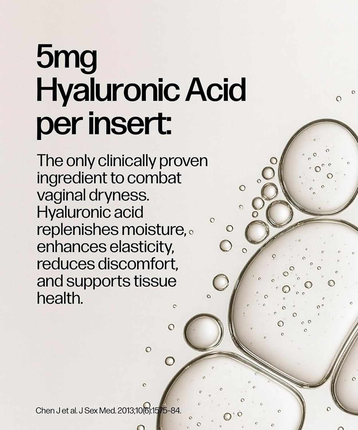 Relief Begins with the 1st Dose: With clean hands, carefully insert 1 solid suppository deeply into the vagina before bedtime (refrigerate to solidify if needed). Some discharge or leaking is normal and expected overnight. Use of a panty liner is recommended as needed. Repeat use once every 2-3 nights and real relief should arrive quickly; clinical research shows that hyaluronic acid can reduce vaginal dryness by up to 49% in as little as nine days.