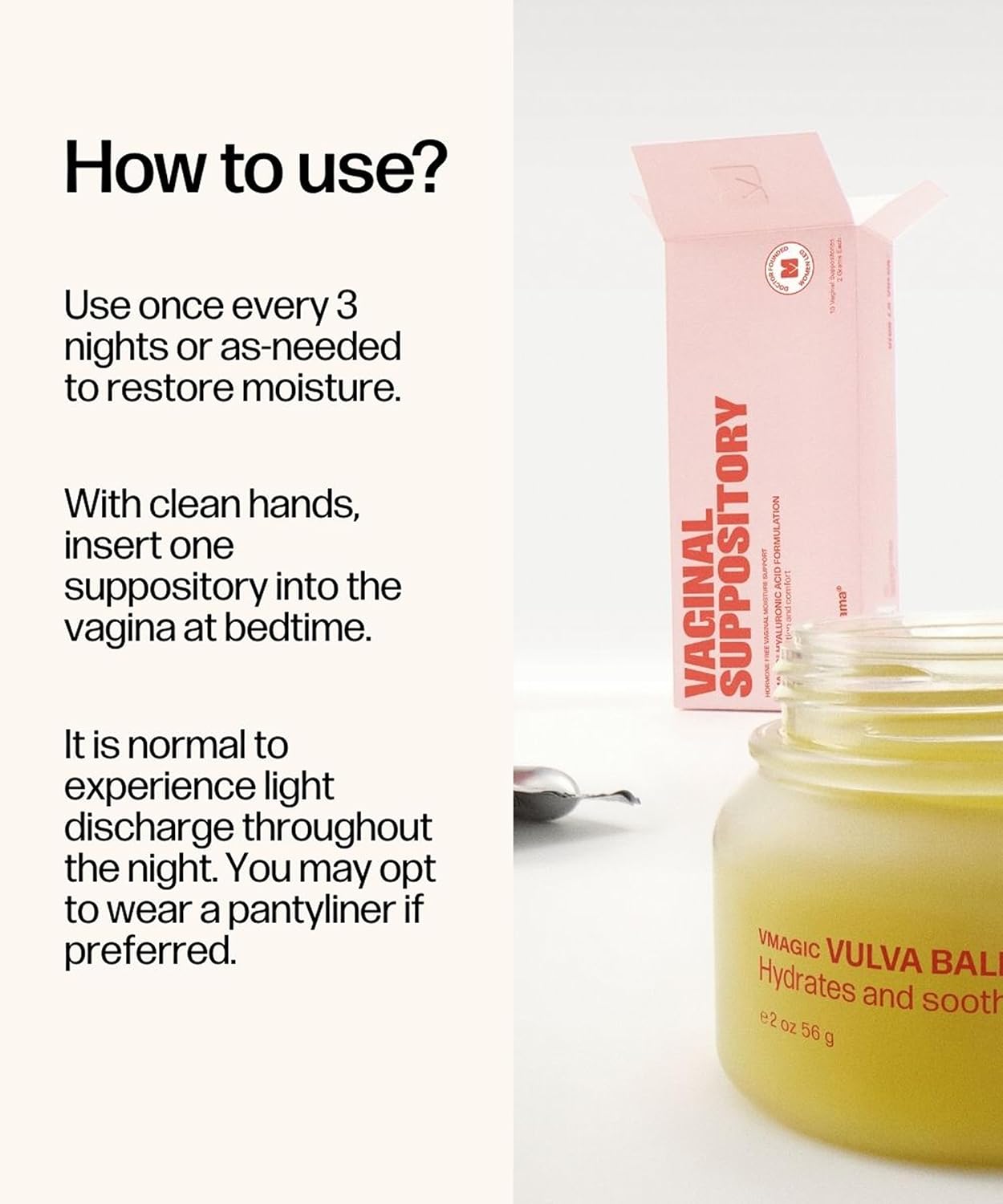 Helps Relieve Dryness & Soothe Irritation: VMAGIC Vaginal Suppository is formulated with hyaluronic acid to deliver deep, long-lasting hydration. In a clinical trial, 84% of women reported improved dryness and 85% reported less itching after one month of use