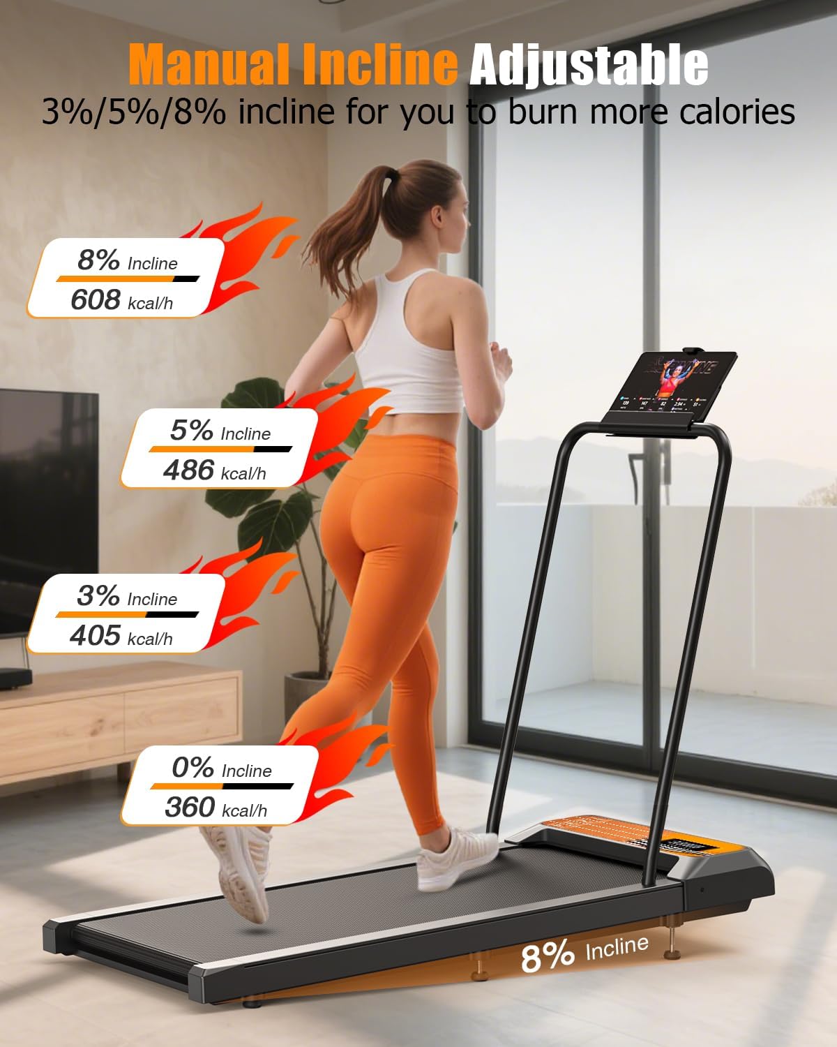 【8% Adjustable Incline and 2.5HP Quiet Motor】 This walking treadmill pad with incline features a built-in 2.5HP quiet motor, allowing you to exercise without disturbing others. It can support a maximum weight of 270 lbs. The 8% incline adjustment simulates an uphill climb, adding a challenge to your workout while burning calories, perfect for your home workout needs
