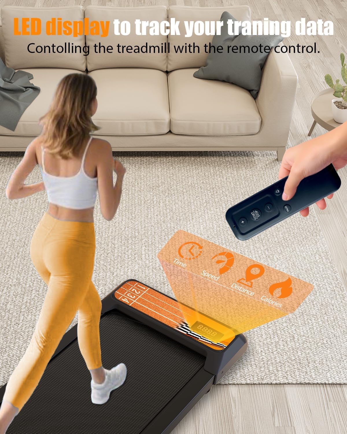 【Remote Control and LED Display】 This walking small pad with handle bar features an LED display that shows speed, distance, time, and calories burned, allowing you to track your workouts in real time. The included remote control allows you to adjust speed and start/stop the portable treadmill without interrupting your exercise, enhancing your exercise experience