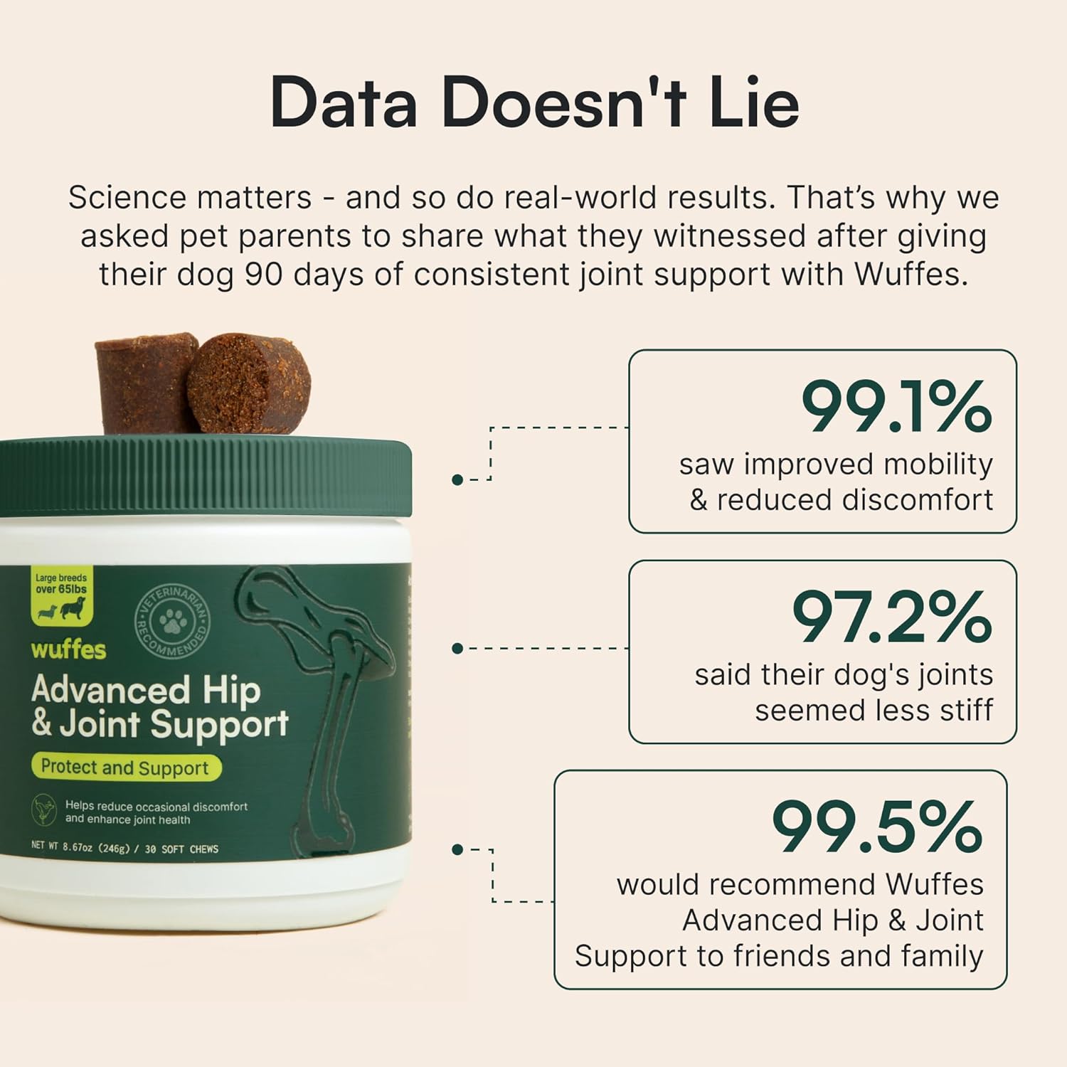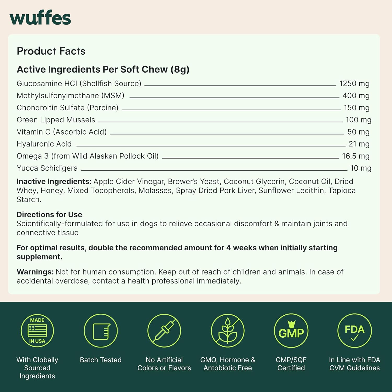 Scientifically-Backed Ingredients: Expertly formulated by our in-house pet scientists, Wuffes Hip & Joint Support is made with ingredients known to help maintain healthy cartilage, promote joint integrity, and support long-term joint health.